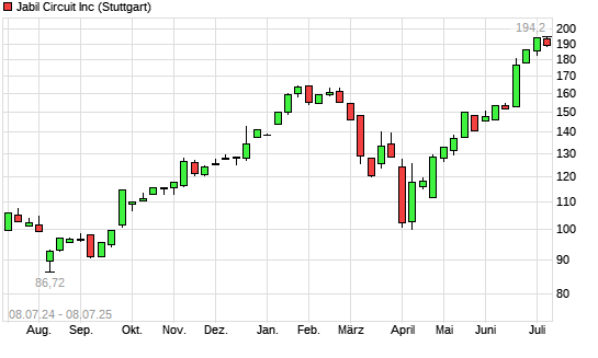 Mit dem Anstieg auf 194,45 EUR hat die Jabil Circuit-Aktie (ISIN US4663131039) am 07.07.2025 ein neues All-Time-High erreicht und damit den Kurs vom 03.07.2025 eingestellt.