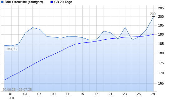 Mit dem Anstieg auf 189,50 EUR hat die Jabil Circuit-Aktie am 28.07.2025 die 20-Tage-Linie nach oben gekreuzt.
