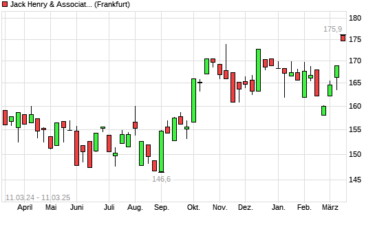 Mit dem Anstieg auf 175,90 EUR hat die Jack Henry & Associates-Aktie (ISIN US4262811015) am 10.03.2025 ein neues 12-Monats-Hoch erreicht und damit den Kurs vom 06.11.2024 eingestellt.