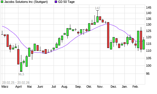 Mit dem Anstieg auf 119,00 EUR hat die Jacobs Engineering Group-Aktie am 19.02.2026 die 50-Tage-Linie nach oben gekreuzt.