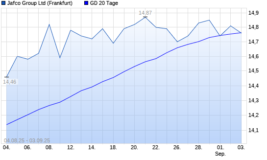 Mit dem Anstieg auf 14,81 EUR hat die Jafco-Aktie am 02.09.2025 die 20-Tage-Linie nach oben gekreuzt.Die Jafco-Aktie befindet sich seit dem 23.04.2025 im langfristigen Aufwärtstrend und hat ...weiterlesen
