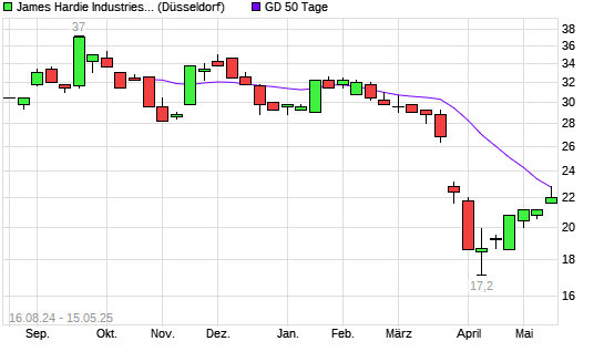 Mit dem Anstieg auf 22,40 EUR hat die James Hardie Industries-Aktie am 14.05.2025 die 50-Tage-Linie nach oben gekreuzt.