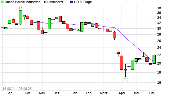 Mit dem Anstieg auf 21,00 EUR hat die James Hardie Industries-Aktie am 04.06.2025 die 50-Tage-Linie nach oben gekreuzt.