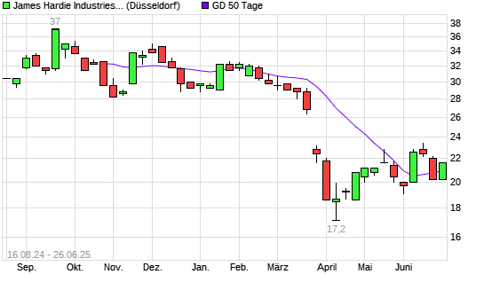 Mit dem Anstieg auf 20,80 EUR hat die James Hardie Industries-Aktie am 25.06.2025 die 50-Tage-Linie nach oben gekreuzt.