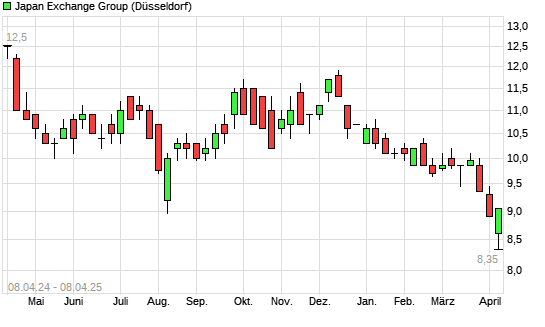 Mit dem Rücksetzer auf 8,75 EUR hat die Japan Exchange Group-Aktie (ISIN JP3183200009) am 07.04.2025 ein neues 12-Monats-Tief erreicht und damit den Kurs vom 04.04.2025 eingestellt.