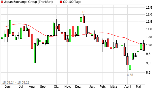 Mit dem Rücksetzer auf 9,85 EUR hat die Japan Exchange Group-Aktie am 14.05.2025 die 100-Tage-Linie nach unten gekreuzt.