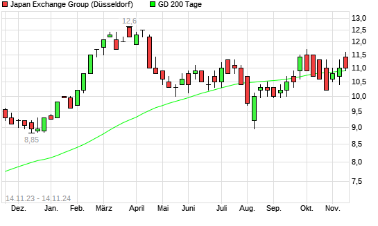 Mit dem Rücksetzer auf 10,90 EUR hat die Japan Exchange Group-Aktie am 13.11.2024 die 200-Tage-Linie nach unten gekreuzt.