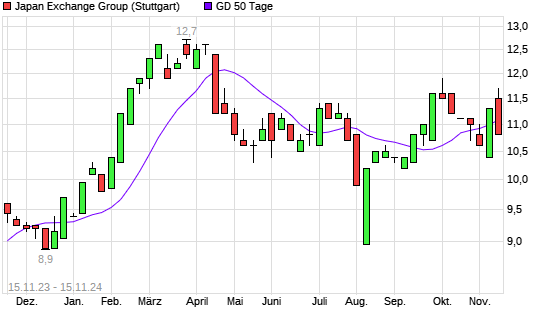 Mit dem Rücksetzer auf 10,70 EUR hat die Japan Exchange Group-Aktie am 14.11.2024 die 50-Tage-Linie nach unten gekreuzt.