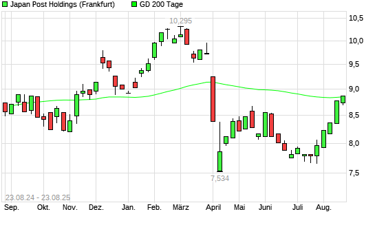 Mit dem Anstieg auf 8,86 EUR hat die Japan Post Holdings-Aktie am 22.08.2025 die 200-Tage-Linie nach oben gekreuzt.
