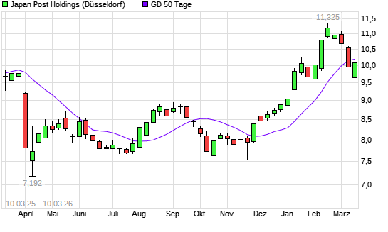 Mit dem Rücksetzer auf 9,68 EUR hat die Japan Post Holdings-Aktie am 09.03.2026 die 50-Tage-Linie nach unten gekreuzt.