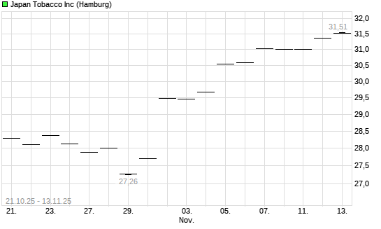 Mit dem Anstieg auf 31,28 EUR hat die Japan Tobacco-Aktie (ISIN JP3726800000) am 12.11.2025 ein neues 5-Jahres-Hoch erreicht und damit den Kurs vom 07.11.2025 eingestellt.