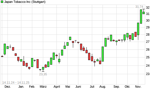 Mit dem Anstieg auf 31,31 EUR hat die Japan Tobacco-Aktie (ISIN JP3726800000) am 13.11.2025 ein neues 5-Jahres-Hoch erreicht und damit den Kurs vom 12.11.2025 eingestellt.