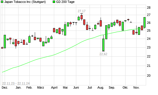 Mit dem Anstieg auf 25,57 EUR hat die Japan Tobacco-Aktie am 21.11.2024 die 200-Tage-Linie nach oben gekreuzt.