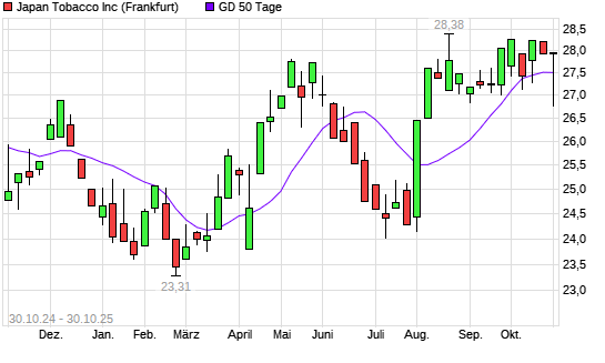 Mit dem Rücksetzer auf 26,76 EUR hat die Japan Tobacco-Aktie am 29.10.2025 die 50-Tage-Linie nach unten gekreuzt.