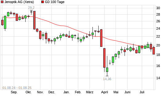Mit dem Rücksetzer auf 18,83 EUR hat die Jenoptik-Aktie am 31.07.2025 die 100-Tage-Linie nach unten gekreuzt.