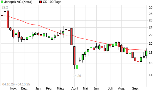 Mit dem Rücksetzer auf 18,31 EUR hat die Jenoptik-Aktie am 03.10.2025 die 100-Tage-Linie nach unten gekreuzt.