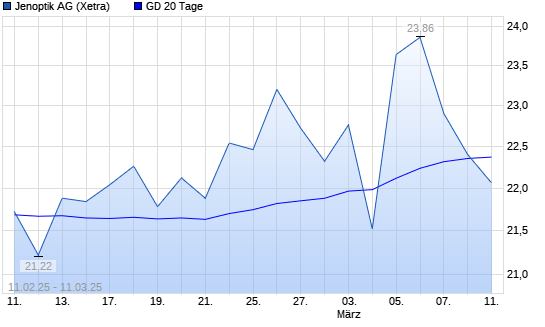 Mit dem Rücksetzer auf 22,20 EUR hat die Jenoptik-Aktie am 10.03.2025 die 20-Tage-Linie nach unten gekreuzt.