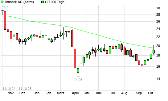 Mit dem Rücksetzer auf 19,15 EUR hat die Jenoptik-Aktie am 10.10.2025 die 200-Tage-Linie nach unten gekreuzt.
