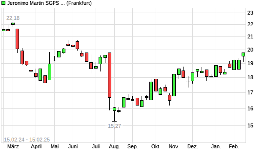 Mit dem Anstieg auf 19,76 EUR hat die Jeronimo Martins-Aktie (ISIN PTJMT0AE0001) am 14.02.2025 ein neues 6-Monats-Hoch erreicht und damit den Kurs vom 10.02.2025 eingestellt.