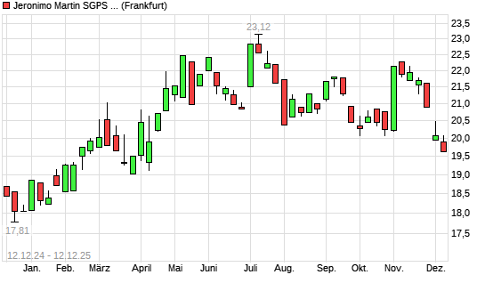 Mit dem Rücksetzer auf 19,83 EUR hat die Jeronimo Martins-Aktie (ISIN PTJMT0AE0001) am 11.12.2025 ein neues 6-Monats-Tief erreicht und damit den Kurs vom 10.12.2025 eingestellt.