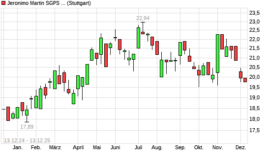 Mit dem Rücksetzer auf 19,62 EUR hat die Jeronimo Martins-Aktie (ISIN PTJMT0AE0001) am 12.12.2025 ein neues 6-Monats-Tief erreicht und damit den Kurs vom 11.12.2025 eingestellt.