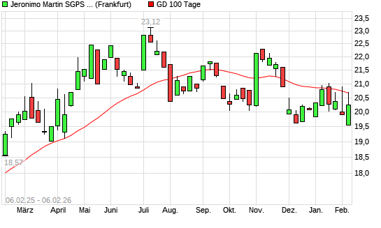 Mit dem Rücksetzer auf 20,42 EUR hat die Jeronimo Martins-Aktie am 05.02.2026 die 100-Tage-Linie nach unten gekreuzt.