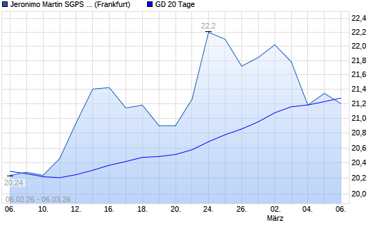 Mit dem Anstieg auf 21,34 EUR hat die Jeronimo Martins-Aktie am 05.03.2026 die 20-Tage-Linie nach oben gekreuzt.Die Jeronimo Martins-Aktie befindet sich seit dem 23.02.2026 ...weiterlesen