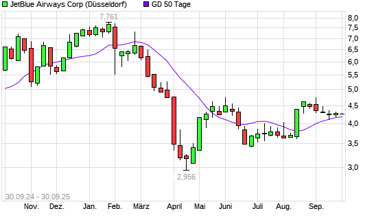Mit dem Anstieg auf 4,25 EUR hat die JetBlue Airways-Aktie am 29.09.2025 die 50-Tage-Linie nach oben gekreuzt.