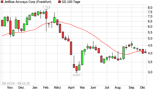 Mit dem Rücksetzer auf 4,02 EUR hat die JetBlue Airways-Aktie am 08.10.2025 die 100-Tage-Linie nach unten gekreuzt.