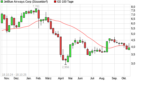 Mit dem Rücksetzer auf 4,02 EUR hat die JetBlue Airways-Aktie am 17.10.2025 die 100-Tage-Linie nach unten gekreuzt.