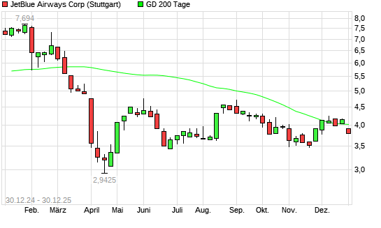Mit dem Rücksetzer auf 3,92 EUR hat die JetBlue Airways-Aktie am 29.12.2025 die 200-Tage-Linie nach unten gekreuzt.