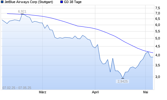 Mit dem Rücksetzer auf 3,95 EUR hat die JetBlue Airways-Aktie am 06.05.2025 die 38-Tage-Linie nach unten gekreuzt.