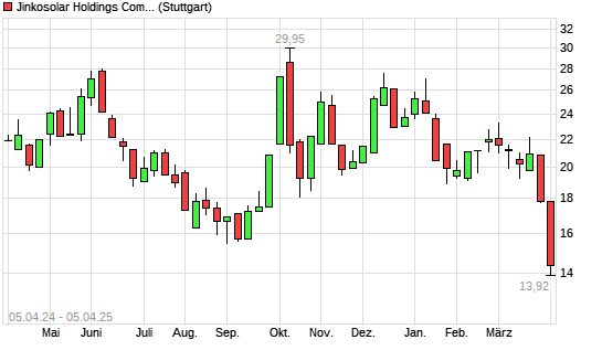 Mit dem Rücksetzer auf 14,10 EUR hat die Jinkosolar-Aktie (ISIN US47759T1007) am 04.04.2025 ein neues 3-Jahres-Tief erreicht und damit den Kurs vom 28.08.2024 eingestellt.