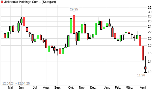 Mit dem Rücksetzer auf 12,56 EUR hat die Jinkosolar-Aktie (ISIN US47759T1007) am 11.04.2025 ein neues 5-Jahres-Tief erreicht und damit den Kurs vom 10.04.2025 eingestellt.