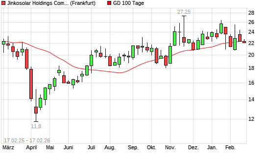 Mit dem Anstieg auf 22,45 EUR hat die Jinkosolar-Aktie am 16.02.2026 die 100-Tage-Linie nach oben gekreuzt.
