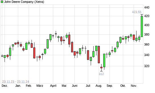 Mit dem Anstieg auf 424,50 EUR hat die John Deere-Aktie (ISIN US2441991054) am 22.11.2024 ein neues 12-Monats-Hoch erreicht und damit den Kurs vom 21.11.2024 eingestellt.