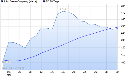 Mit dem Rücksetzer auf 446,15 EUR hat die John Deere-Aktie am 29.05.2025 die 20-Tage-Linie nach unten gekreuzt.