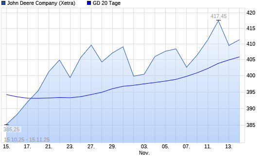 Mit dem Rücksetzer auf 405,40 EUR hat die John Deere-Aktie am 14.11.2025 die 20-Tage-Linie nach unten gekreuzt.