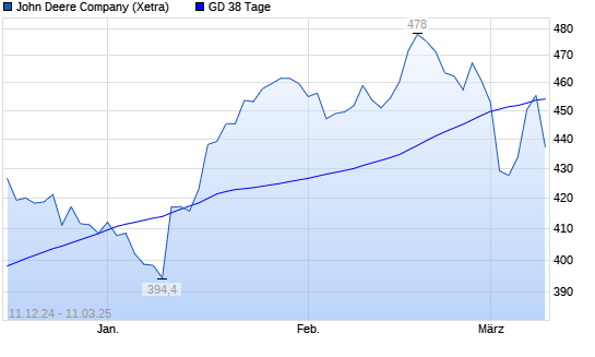 Mit dem Rücksetzer auf 450,35 EUR hat die John Deere-Aktie am 10.03.2025 die 38-Tage-Linie nach unten gekreuzt.