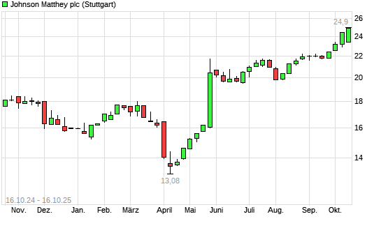 Mit dem Anstieg auf 25,00 EUR hat die Johnson Matthey-Aktie (ISIN GB00BZ4BQC70) am 15.10.2025 ein neues 12-Monats-Hoch erreicht und damit den Kurs vom 13.10.2025 eingestellt.