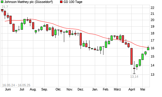 Mit dem Anstieg auf 15,98 EUR hat die Johnson Matthey-Aktie am 15.05.2025 die 100-Tage-Linie nach oben gekreuzt.