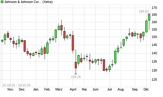 Mit dem Anstieg auf 164,76 EUR hat die Johnson & Johnson-Aktie (ISIN US4781601046) am 09.10.2025 ein neues 12-Monats-Hoch erreicht und damit den Kurs vom 08.10.2025 eingestellt.