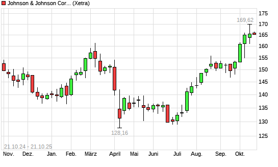 Mit dem Anstieg auf 166,22 EUR hat die Johnson & Johnson-Aktie (ISIN US4781601046) am 20.10.2025 ein neues 12-Monats-Hoch erreicht und damit den Kurs vom 15.10.2025 eingestellt.