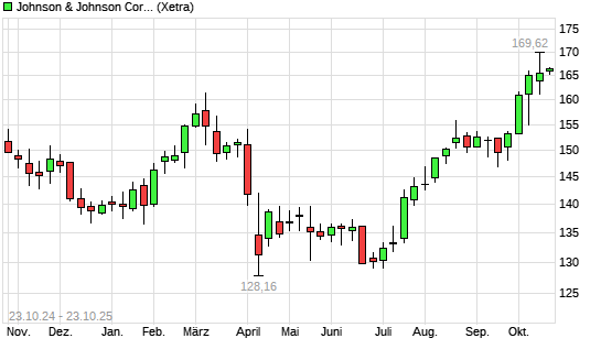 Mit dem Anstieg auf 166,98 EUR hat die Johnson & Johnson-Aktie (ISIN US4781601046) am 22.10.2025 ein neues 12-Monats-Hoch erreicht und damit den Kurs vom 21.10.2025 eingestellt.