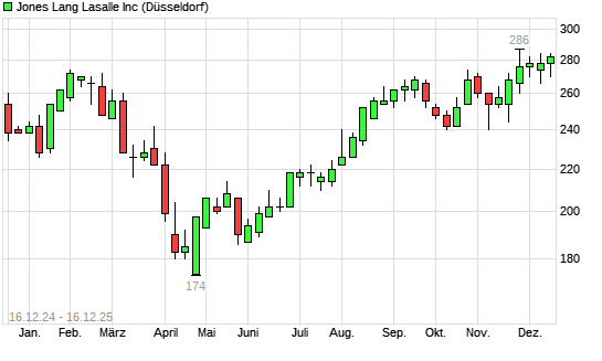 Mit dem Anstieg auf 290,00 EUR hat die Jones Lang LaSalle-Aktie (ISIN US48020Q1076) am 15.12.2025 ein neues All-Time-High erreicht und damit den Kurs vom 12.12.2025 eingestellt.