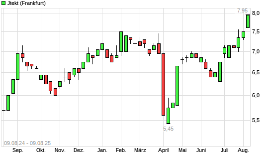 Mit dem Anstieg auf 7,95 EUR hat die Jtekt-Aktie (ISIN JP3292200007) am 08.08.2025 ein neues 12-Monats-Hoch erreicht und damit den Kurs vom 05.08.2025 eingestellt.