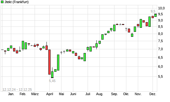 Mit dem Anstieg auf 9,50 EUR hat die Jtekt-Aktie (ISIN JP3292200007) am 11.12.2025 ein neues 5-Jahres-Hoch erreicht und damit den Kurs vom 10.12.2025 eingestellt.