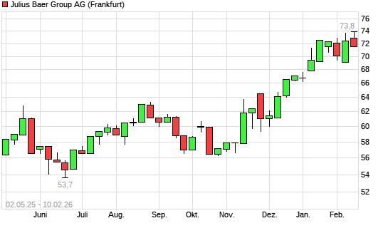 Mit dem Anstieg auf 73,80 EUR hat die Julius Baer Group-Aktie (ISIN CH0102484968) am 09.02.2026 ein neues All-Time-High erreicht und damit den Kurs vom 03.02.2026 eingestellt.
