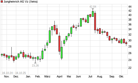 Mit dem Rücksetzer auf 28,50 EUR hat die Jungheinrich Vz-Aktie (ISIN DE0006219934) am 15.10.2025 ein neues 6-Monats-Tief erreicht und damit den Kurs vom 14.10.2025 eingestellt.