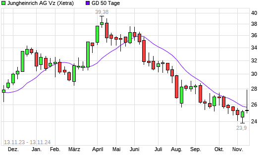 Mit dem Anstieg auf 26,82 EUR hat die Jungheinrich Vz-Aktie am 12.11.2024 die 50-Tage-Linie nach oben gekreuzt.